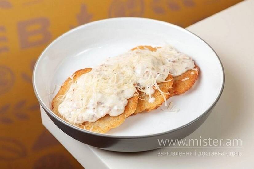 Хрусткі картопляні панкейки з сирно-вершковим соусом, хрустким беконом, цибулевим кранчем та пармезаном.