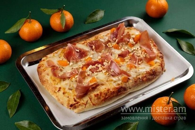 Соус Айолі- Песто-лимон, мандарини консервовані, сир моцарелла бейбі, томат коктельний, хамон, горіх кеш`ю.