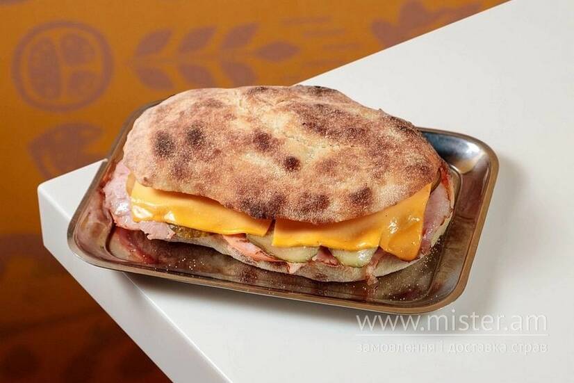 Шинка, бекон, тостовий сир, консервований огірок та томатний соус.