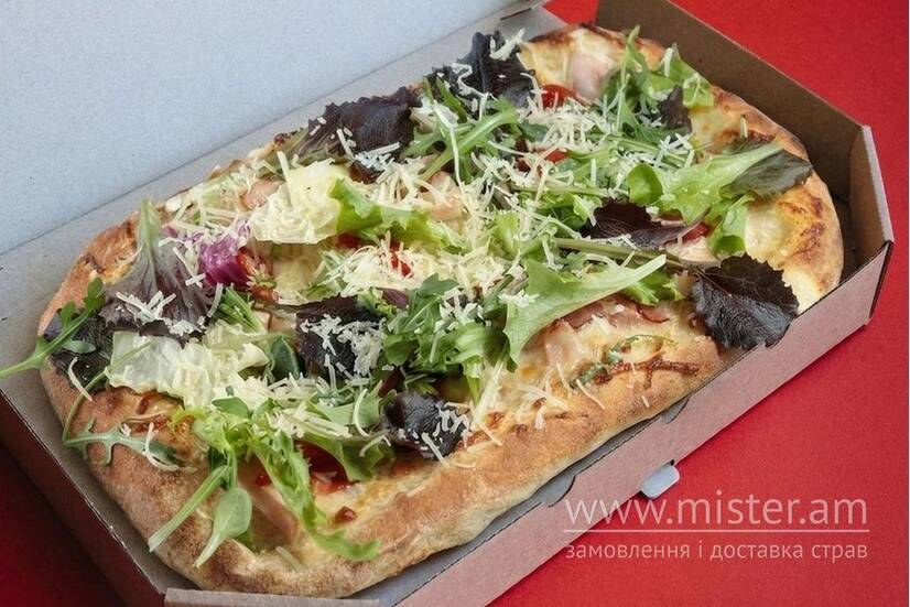 Вершковий соус, соус цезар, сир моцарела, куряче філе варене, бекон, томати чері, мікс салатів, пармезан.
