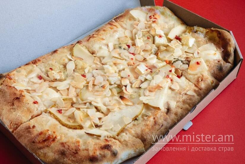 Соус дорблю-арахіс, соус вершковий, сир моцарела, сир дорблю, сир брі, сир моцарела бейбі, груша, мигдалеві пластівці, гострий мед.