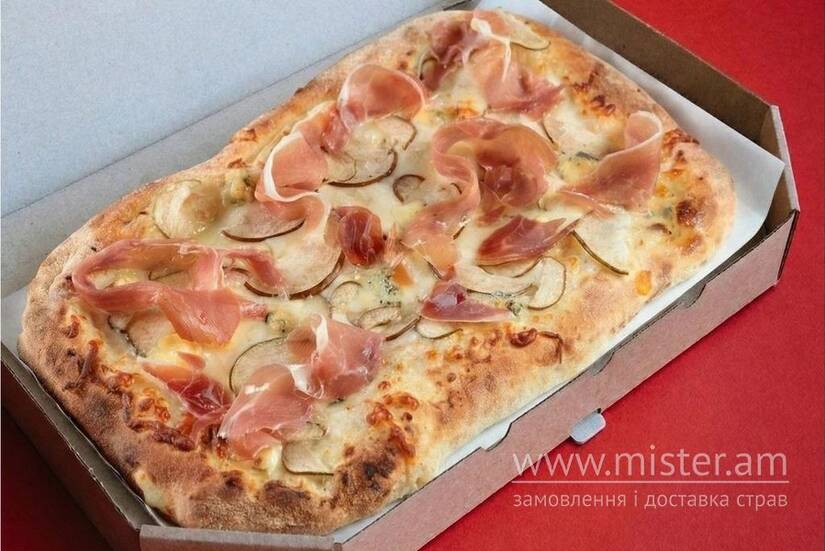 Вершковий соус, сирний соус, сир моцарела, хамон, груша, сир дорблю.