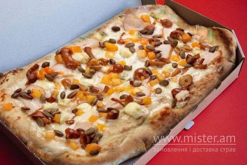Соус вершковий, соус сирний, сир моцарелла, куряче філе копчене, мариновані опеньки, гарбуз маринований, сир дор блю, кленовий сироп, гарбузове насіння.