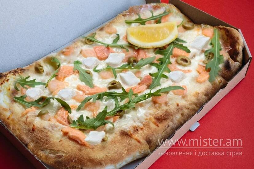 Cоус вершковий, сир моцарела, слабосолений лосось, креветка, крем-сир, оливки, рукола, лимон.