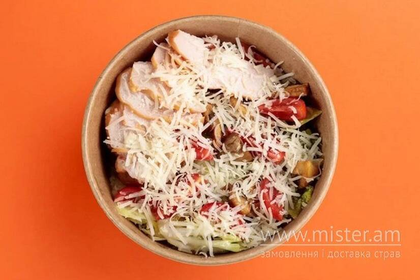 Мікс салату, куряче філе копчене, смажені печериці, томати чері, соус гірчично-медовий, сир пармезан.