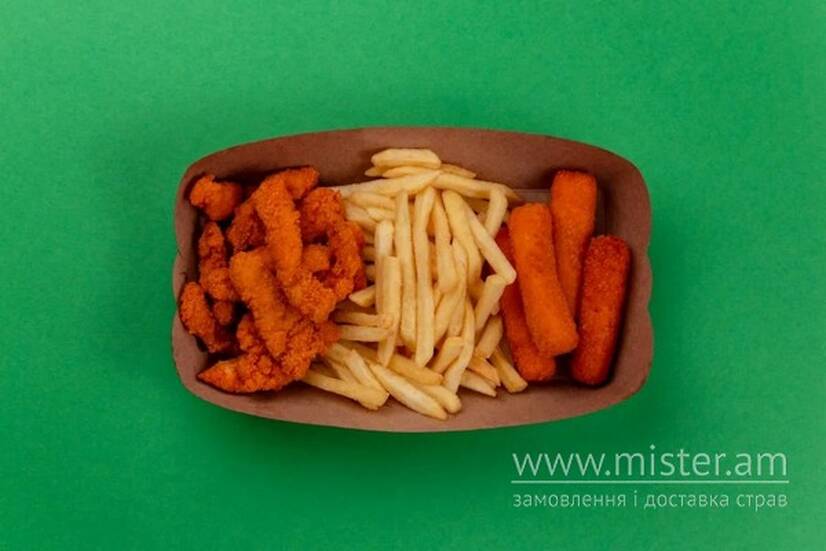 Картопля фрі, сирні палички, курячі стріпси та Кетчуп і соус Цезар.