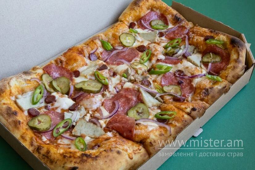 Томатний соус, вершковий соус, шрірача соус, сир моцарела, свинина, мисливські ковбаски, варено-копчена ковбаса, солоні огірки, синя цибуля, перець чилі.