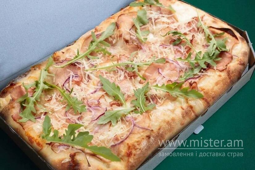 Вершковий соус, сир моцарела, бекон, шинка, синя цибуля, пармезан, рукола.