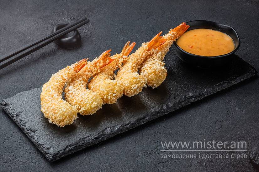 Креветка, кляр темпура, сухарі панко, борошно темпура, соус Світ Чилі.