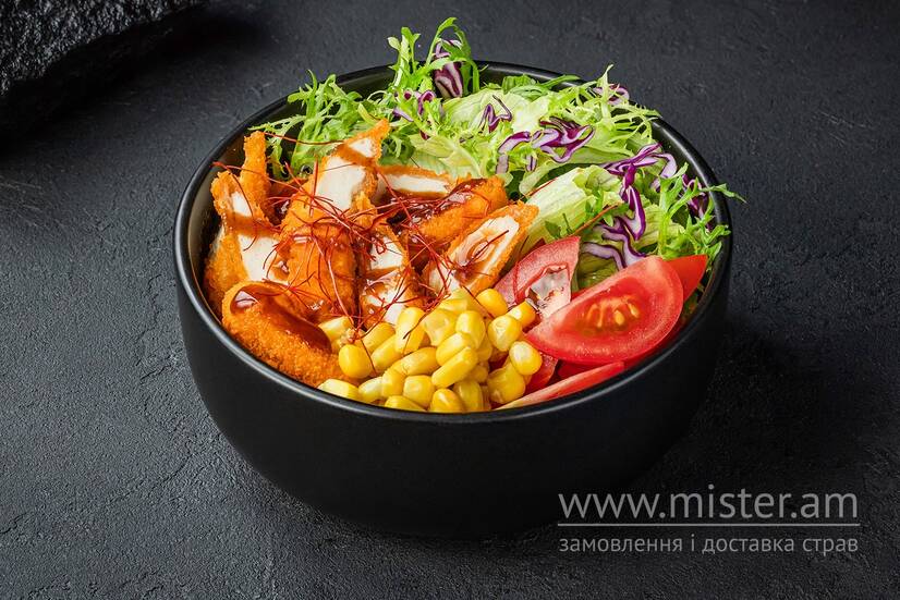 Рис, курячі стріпси, кукурудза, соус Тонкацу, мікс салату, соус Світ Чилі, соус Ланч Кінг, лимон, чилі нитка.