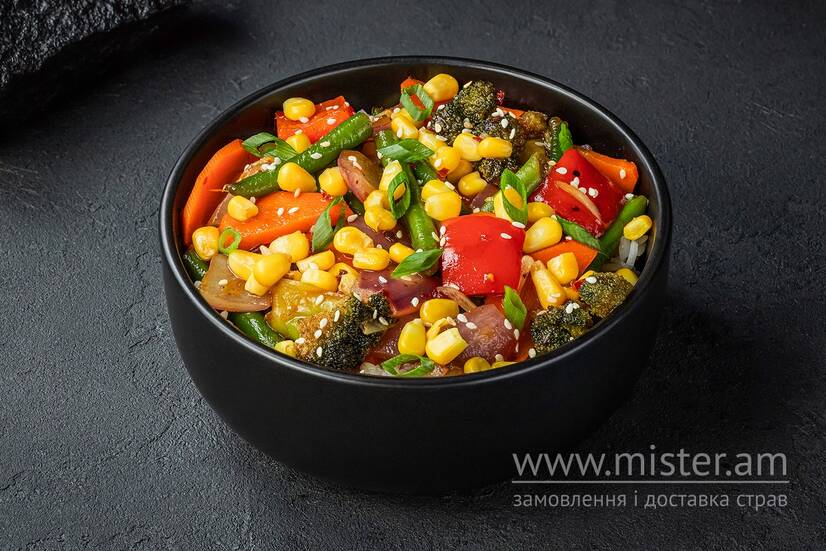 Рис, бульйон курячий, броколі, спаржа, перець болгарський, морква, цибуля синя, мікс імбир-часник, кукурудза, цибуля зелена, соус Пад Тай, кунжут.