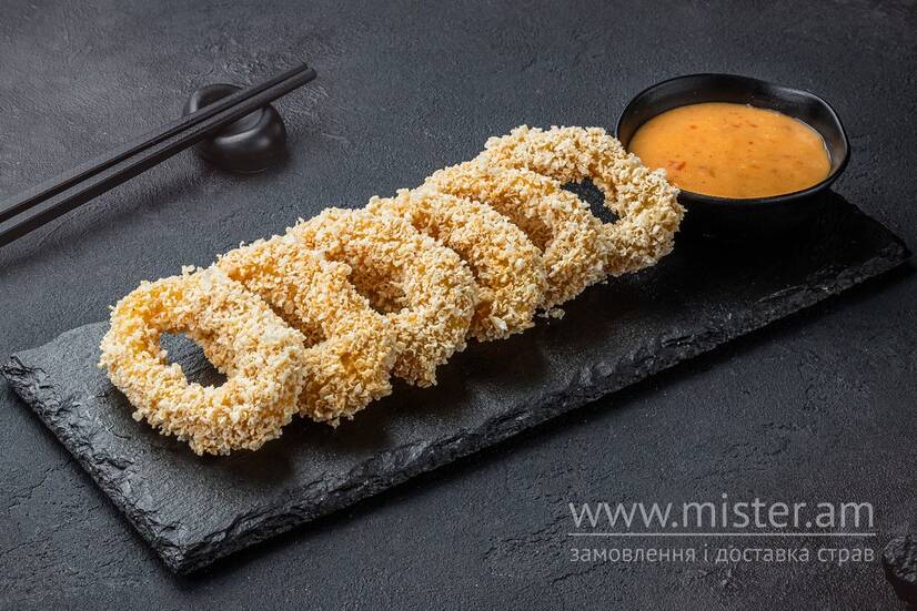 Кальмар, кляр темпура, сухарі панко, борошно темпура, соус Світ Чилі.