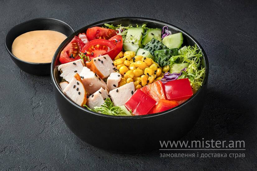 Філе копченої курки, кіноа, огірок, помідор, мікс салату, кукурудза, болгарський перець, соус Ланч Кінг, соус Світ Чилі, кунжут.