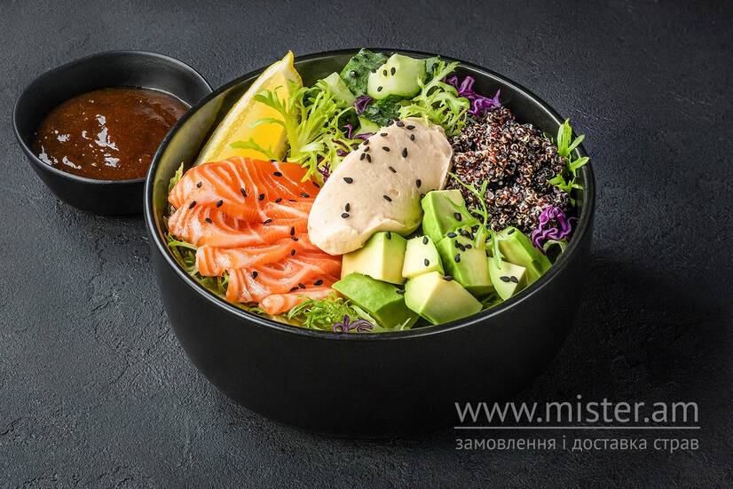 Лосось, кіноа, огірок, авокадо, мікс салату, крем сир, соус Устричний, соус Азія BBQ, соус Ланч Кінг, соус Понзу, лимон, кунжут.