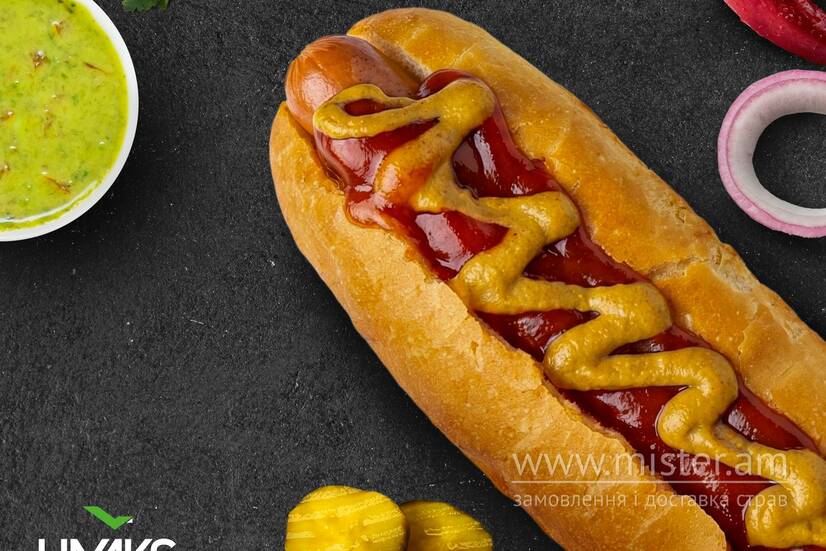 Булка крафтова, сосиска гриль, капуста свіжа, соус томатний, соус гірчиця, огірок маринований, морква гостра.