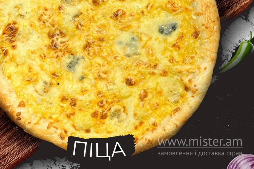 Тісто крафтове, соус сирний, соус бешамель, сир пармезан, сир дор блю, сир чедер, сир моцарела.