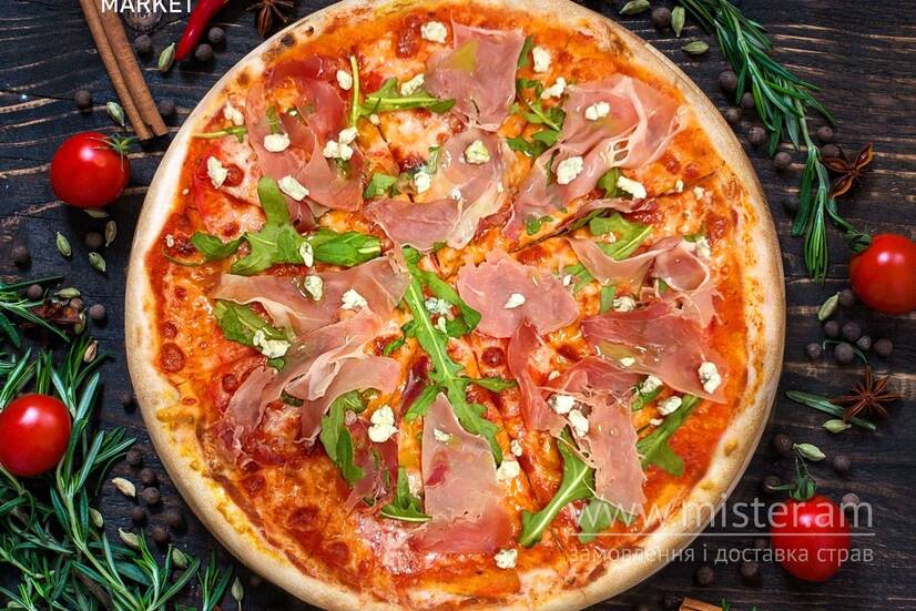 Тісто, соус, томати, моцарела, прошутто, сир дор блю, рукола.
