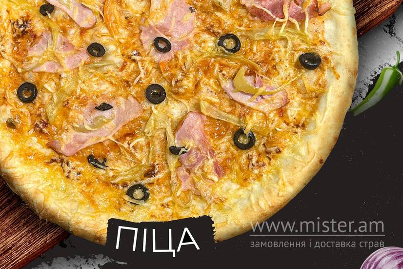Тісто крафтове, балик, сир чедер, маслини, перець болгарський, соус італійський.