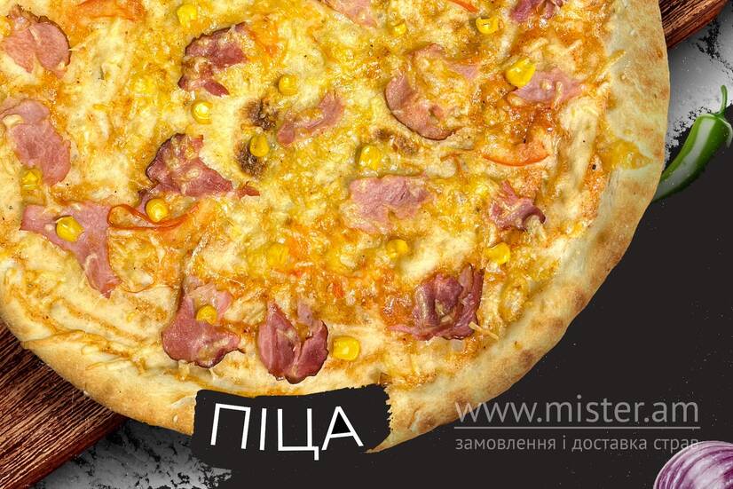 Тісто крафтове, соус томатний, балик, кукурудза консервована, соус сирний, соус бешамель, сир чедер, помідори.
