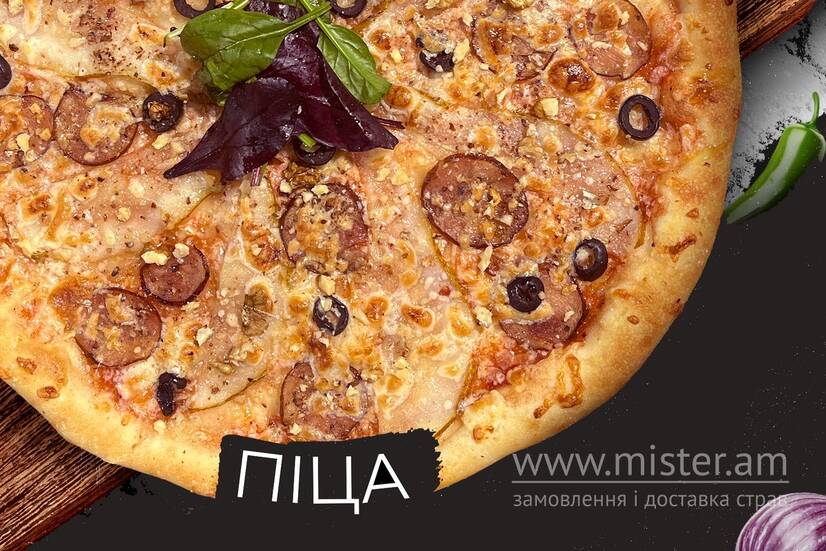 Тісто крафтове, соус томатний, сир моцарела, маслини, ковбаса на дровах, балик, груша, горіхи, мед, зелень.