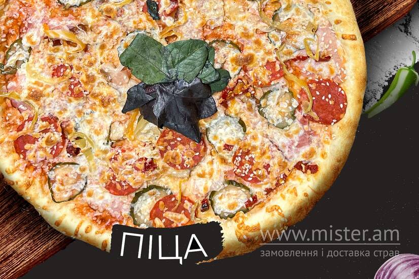 Тісто крафтове, соус томатний, цибуля маринована, ковбаски пепероні, балик, бекон, перець болгарський, огірок маринований, перець чілі, сир моцарела, кунжут, зелень.