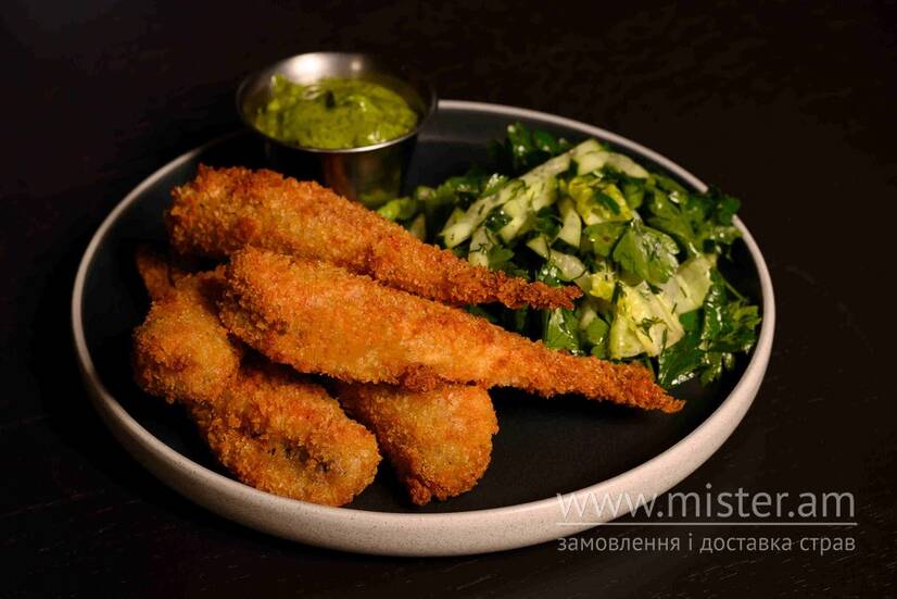 Хрусткі креветки з кропним айолі та салатом