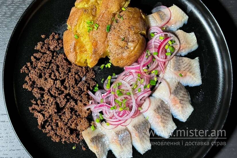 Оселедець з кранчем з бородинського хліба та маринованою цибулею.