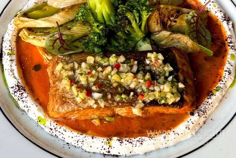 Соковитий лосось, подається з лимоним лабне. Доповнений томатно-креветочним соусом, грильованими артишоками, кільцями шалоту та суцвіттями броколі.