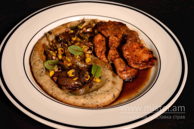 Ніжна вирізка зі свинини, маринована та обсмажена до соковитої скоринки. Подається з кремовим картопляним пюре з грибною тартуфатою, смаженими гливами, беконом і кукурудзою. Страву доповнюють цибуля з димком, пікантна петрушка з часником і насичений деміглас.