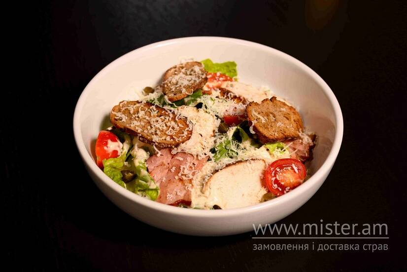 Курка, бекон,листя салату ромен,томати чері,каперси та пармезан.