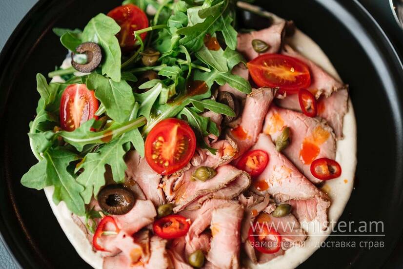 Ніжний телячий ростбіф із руколою та томатами, доповнений витонченим соусом тоннато з тунця та каперсів.