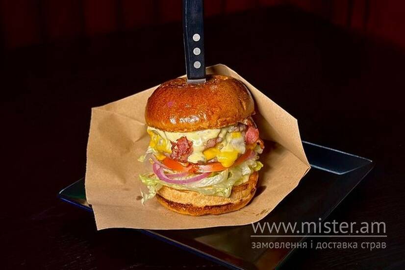 Три соковиті котлети зі свинини, танучі в роті сири чедер та дорблю, хрумкий бекон і свіжий айсберг — усе це зібране в ідеальному бутерброді з соусом дорблю. Вибух смаку для справжніх поціновувачів!