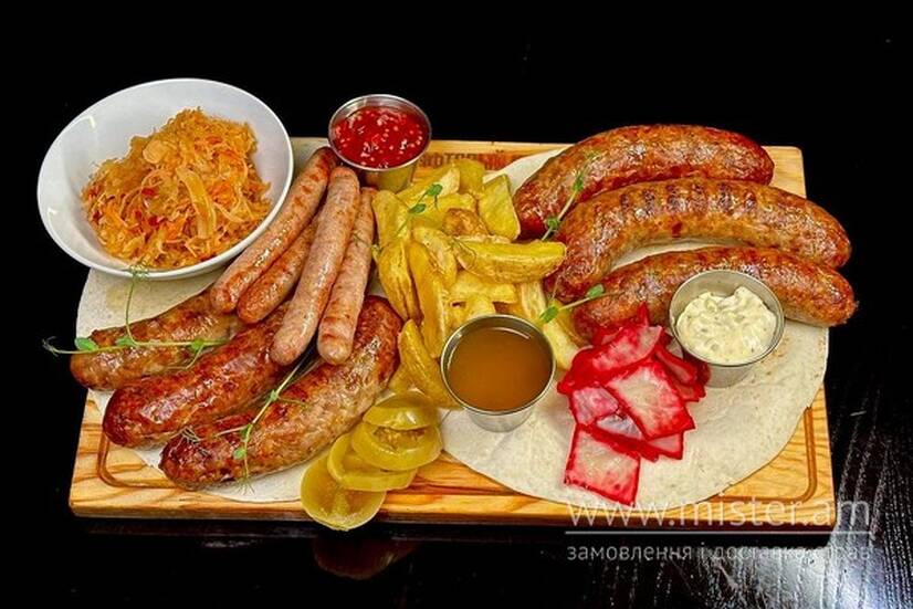 Велика дошка, що збирає найкращі домашні ковбаски: гостра з гірчицею, насичена часникова та класична українська. Все це — з хрумкою капустою, скибками запеченої картоплі і трьома соусами — часниковим, BBQ і кисло-солодким. Ідеальна страва для великої компанії або справжніх м’ясних гурманів.