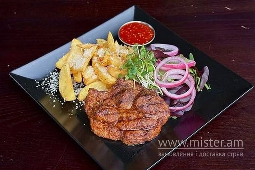 Соковитий стейк зі свинини, поданий з картоплею під ніжним шаром пармезану та свіжою зеленню. Ідеальне поєднання насиченого м`яса і легкого гарніру.