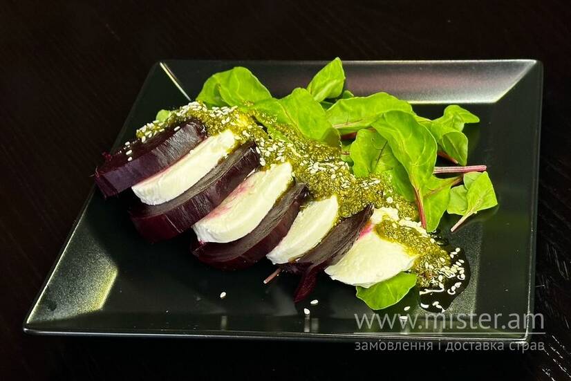 Карамелізований буряк, ніжна моцарела, свіжий салат і хрусткий кунжут під соусом песто — яскравий і несподіваний варіант класики.