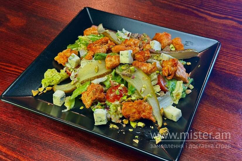 Ніжність карамелізованої груші, гострота сиру дор-блю, хрумкі фісташки і соковите куряче філе на міксі свіжих салатів — поєднання, яке не залишить байдужим.