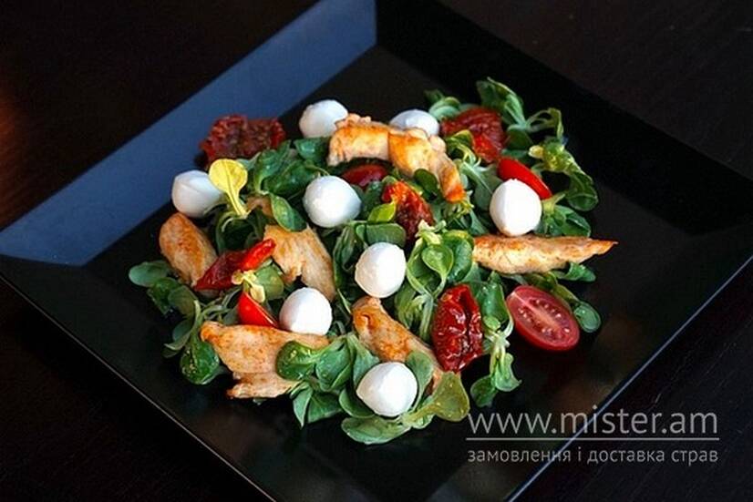 Поєднання курячого філе, соковитих в`ялених томатів, чері, моцарели та міксу салатів у медово-гірчичному соусі — баланс смаку та легкості.