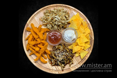 Вуха по-корейськи, вуха по-тайськи, гострі Тортільяс, нагетси, соуси: солодкий чілі, часниковий.