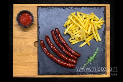 Чотири мисливські ковбаски з картоплею фрі та кетчупом.