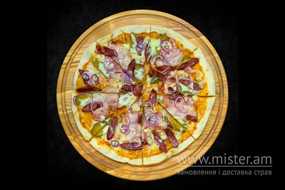 Мисливські ковбаски, бекон, цибуля, солоний огірок, сир Моцарелла.